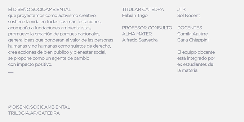 El diseño socioambiental que proyectamos como activismo creativo, sostiene la vida en todas sus manifestaciones, acompaña a fundaciones ambientalistas, promueve la creación de parques nacionales, genera ideas que ponderan el valor de las personas humanas y no humanas como sujetos de derecho, crea acciones de bien público y bienestar social, se propone como un agente de cambio con impacto positivo.